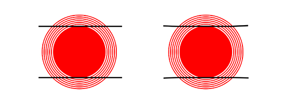 左図 円と上下の線画の幅が同じ場合です。円は真円です。